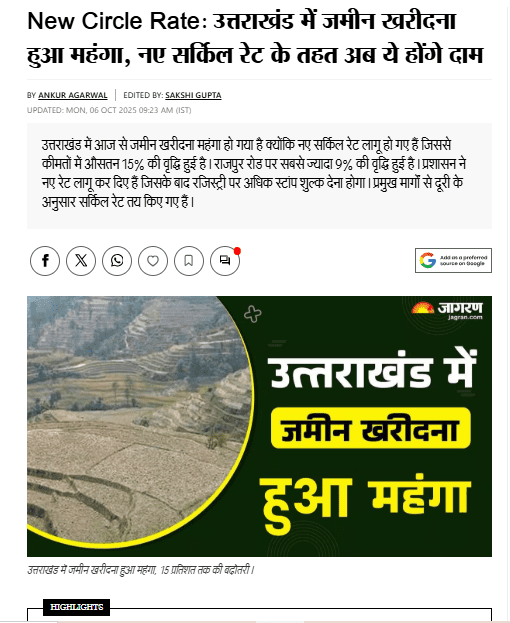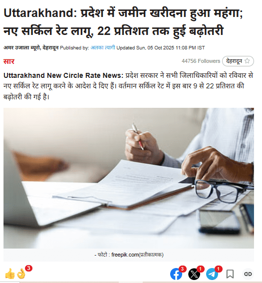 The new circle rate in Uttarakhand 2025 varies depending on the location, type of property, and proximity to urban areas. Amar Ujala, October 2025: Report on 22% increase in land prices with new circle rates.