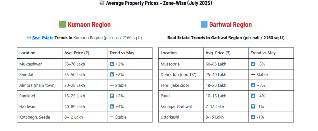 Nainital & Mukteshwar: Average prices near ₹5,945 per sqft in Nainital; Mukteshwar properties average ₹55–70 lakh per nali, showing a 5% price increase due to strong demand and tourism.